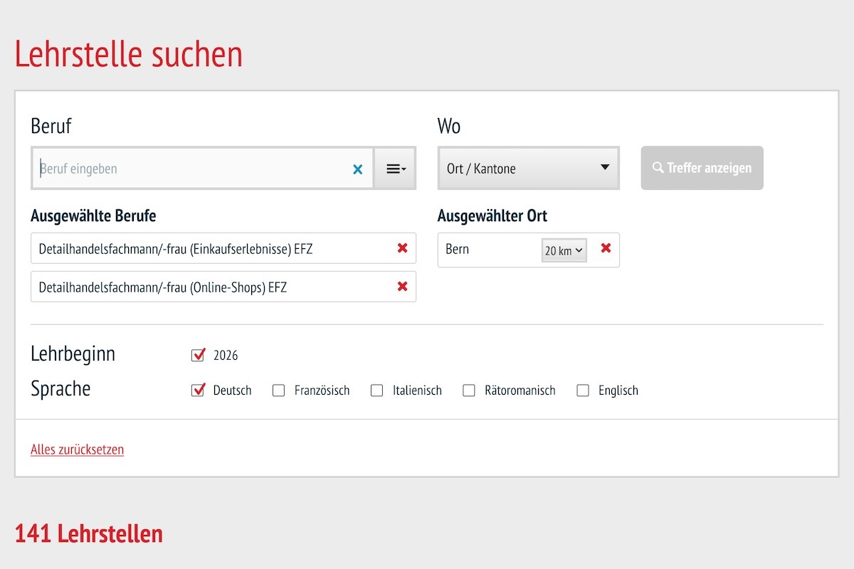 Das schafft Klarheit. Über eine einzige Suche erhalten Jugendliche Zugriff auf alle ausgeschriebenen Lehrstellen – auch solche aus Nachbarkantonen. Davon profitieren Lehrbetriebe an der Kantonsgrenze. Geben beispielsweise Jugendliche aus Egerkingen (SO) in der Suchmaske «Suche im Umkreis von 20 Kilometern» ein, erhalten sie auch Treffer aus Langenthal. Bei LENA war dies nicht der Fall.